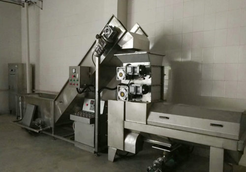 將經(jīng)過挑選、清洗的新鮮石榴切口、擠開、分離出石榴皮,并將果漿輸送至壓榨機進行下道工序的生產(chǎn)。